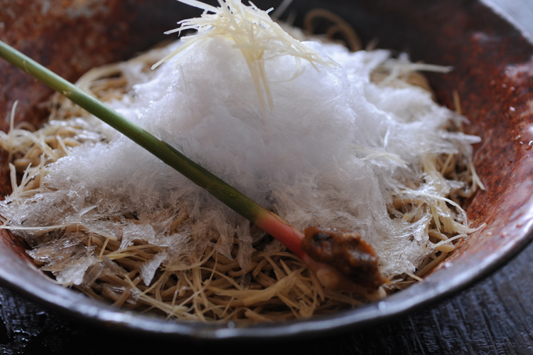 店主の小澤さんは 「今年は節電の夏で、室内の設定温度も低くは出来ないし、何か涼しげなお蕎麦を味わってもらおうと思って・・」 とさっぱりとした 「生姜切りそば の上に 「かき氷(日光の天然氷ではありませんが)」 でキンキンに冷やした 「谷中かき氷蕎麦」 を今年は提供中とのことです。