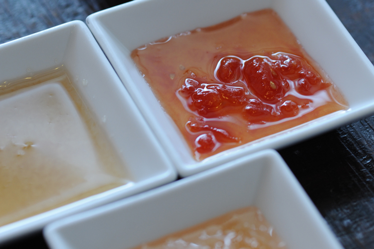 かき氷にかけられるシロップは 「トマト」 「ブルーべりー」 「生姜」 「とちおとめ」 などのシロップは果物や野菜とてんさい糖で作られた五大自家製のものです。素材の果物や野菜はいずれもなるべく農薬の使われていないものを選びます。 砂糖もてんさい糖にこだわったのは、理由があります。  砂糖の中には、さとうきびを原料とするものと、砂糖大根(てんさい)を原料とするものの2種類があります。 白砂糖、三温糖、きび砂糖、黒砂糖など、砂糖といわれているもののほとんどは、さとうきびを原料にしています。  「てんさい糖」だけが砂糖大根が原料なのですが、そのふたつの原料には大きな違いがあります。  マクロビオティック (自然食療法) の本によるとてんさい糖は砂糖大根が原料なので多糖類と呼ばれ他の砂糖と違いゆっくりと消化されると言われています。 そして血糖値の上下が緩慢で、かつ吸収に時間がかかるので少しの糖分で長い時間もちます。