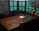 以前は店主の澁田剛さんが週末以外は厨房も接客も一人でこなしていた。 初めて訪問したとき誰も出てこないので一人ぽつねんと待っていた心細さを思い出す。 細やかな心遣いを見せる女将さんの案内で庭に面した、大きなテーブルの前に座る。 傾いだ松の木、店名の由来となった柿の木、自然のまま山野草が生い茂る庭。 草庵めいた雰囲気がますます強くなっていた。 テーブルとガラス越しに見る、ここからの眺めは時折思い出すくらいに気に入っている。