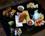 大きなプレート皿に美しく盛られて供される。 蕎麦屋の定番素材である鴨のほかに魚も大胆に使っているのに驚く。 本来、蕎麦屋は生の魚を使わないのが不文律だが、澁田さんは築地から魚を仕入れている。