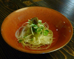 京風や塩ベースではなく醤油ベースの甘じょっぱい味つけ。 素材なら鱧より穴子だ。 「天穏」の純米吟醸に移って少し飲み疲れたところで、さらしなの十割。 ごく少量の箸休めのような蕎麦がさりげなく出てきた。 続いて出し巻き玉子。
