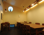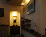 住宅街の一角に建つのは明るい色彩の洋風建築。柴又なら和の空間という予想は快く裏切られ、外壁を淡いクリーム色で塗られた南欧風の建物である。 はじめて見たときは驚いたものだが、開店して10年。周囲の景色と馴染んできたように思う。木の扉を開けて中に入ると、店内は天井までの吹き抜けになっている。天窓があるものの目線の高さに窓はなく細長いステンドグラスがあるのみ。 照明は銅板を腐食させてできた無数の穴から洩れる灯り。 穴蔵のような異空間に入り、一瞬にして非日常の世界へと紛れ込んだ。