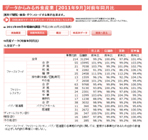 来客数前年比は99.0%だったが、客単価が103.0%となり売上101.9%と前年を上回った。業種別では、店舗数前年比が伸びたこともあり麺類は売上前年比111.5%と好調だった。一方、これまで比較的好調だった牛丼などの和風は、売上前年比91.3%と伸び悩んだ。(※1年前に大手各社が新商品の展開などで客足が堅調だったことの反動が、大きな要因)持ち帰り米飯/回転寿司も、大手企業で昨年販促セールを展開した反動などもあり、96.1%と前年割れとなった。