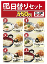 讃岐うどんとトッピングとおむすびの組み合わせを日替わりで通常よりお得なセット550円(税込み)で提供する。