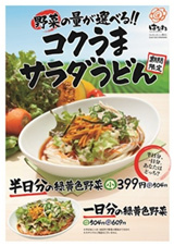 昨年4月に西日本・北海道地区限定で販売した「日本応援うどん(コクうまサッパリサラダうどん)」は、1日に必要な緑黄色野菜120gを召し上がっていただけるメニューとして、健康志向のお客様から好評だったことから今年は全国の店舗での発売に繋がった。