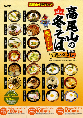 2013年1月19日から3月31日の間、京王電鉄株式会社と「冬そばキャンペーン」実行委員会は、「第11 回高尾山の冬そばキャンペーン」を実施する。 これは、地域振興の一環として京王電鉄と「冬そばキャンペーン」実行委員会が共同企画し、美味しい「高尾山とろろそば」の魅力をアピールしているキャンペーンで、今年で11 年目を迎える。