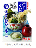 「冷やし穴子おろしそば」は、一本揚げ穴子、なす、いんげんの天ぷらに加え、ほうれん草、焼き海苔、大根おろし、わさびを添えたさっぱりした味わいのぶっかけおろしそば。