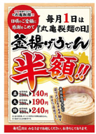 2013年8月よりトリドールが運営する丸亀製麺では、毎月1日を「丸亀製麺の日」として【釜揚げうどん半額セール】を全国店舗のうち500店で実施する。