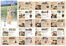 茨城県の「やさとグリーンツーリズム協議会」は、石岡市旧八郷地区にあるそば店の魅力を知ってもらおうと、地域内にあるそば店17店舗を「常陸秋そばを使い、手打ちで作っている店を条件に紹介するパンフレットを作製した。サイズはA3サイズが四つ折りになっており、ポケットサイズで持ち歩きに便利。地図を見開くと、各店舗と顔写真入りの店主がお勧めそばや自店の特長を紹介している。