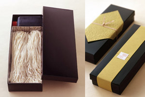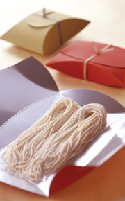 自分が自宅で食べるように購入するのならともかく、たしかに普段お世話になった人に年末の挨拶がてら持っていく 「年越しそば」 だったら、【お中元・お歳暮の時の高級デパートの包装紙】 ではありませんが、「ちょっとよそゆきな折箱や包装」 も一つの演出として必要なのかもしれません。