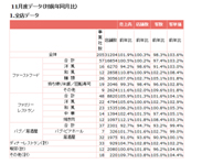 11月は、比較的天候に恵まれ、前年より土・日・祝日の合計が2日多く、引き続き客単価が堅調に推移したことなどから、全体売上は前年比101.9%と6カ月ぶりに前年を上回った。