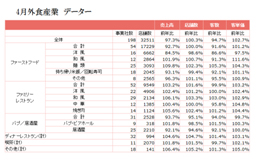 4月は、前半の天候不順が客足に影響したものの、後半は好天に恵まれ東京では夏日となる日もあり、需要は回復基調となった。しかし、FR、DR等がおおむね好調を維持する一方、FF洋風では売り上げの低迷が続き、外食全体の売上は97.3%と2カ月連続して前年を下回った。