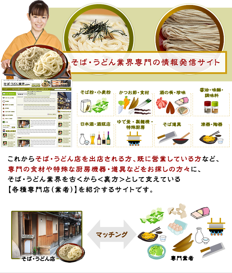 そば・うどん業界.comでは、これからそば・うどん店の出店を予定されるている方、既にそば・うどん店を営業している方など、そば・うどん業界で専門の食材や特殊な厨房機器・道具などをお探しの方々に、各種専門店、専門業者を紹介している情報サイトです。